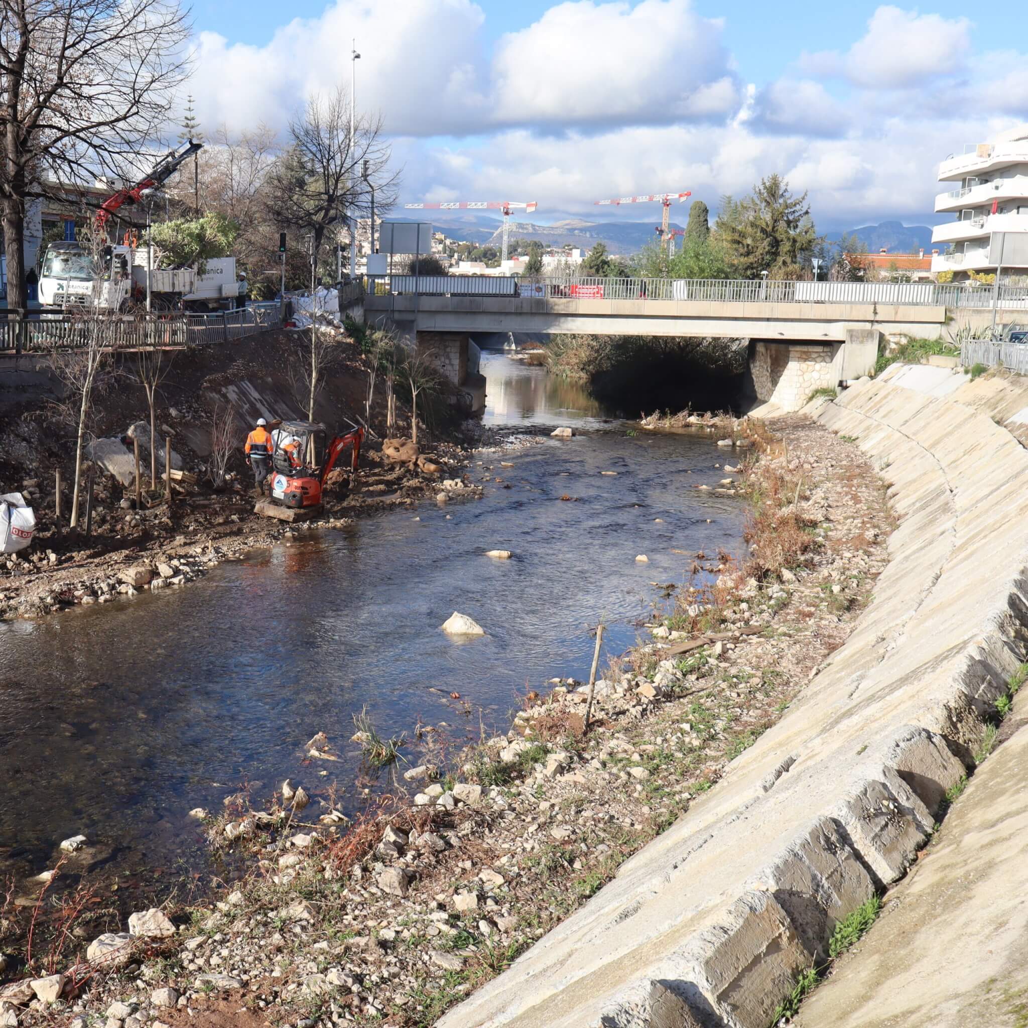 L’objectif des travaux est de sécuriser et de stabiliser les terrains en rive droite du Loup, à Villeneuve-Loubet, de supprimer le risque d’affouillement de la berge entrainant la voie dans le cours d’eau et ainsi de protéger les usagers, les riverains et les biens. Le but est de protéger le talus amont et le pied de berge en réalisant une carapace en enrochement bétonné sur un linéaire de 100 mètres pour éviter l’érosion de la berge du Loup soutenant la RD2D.
