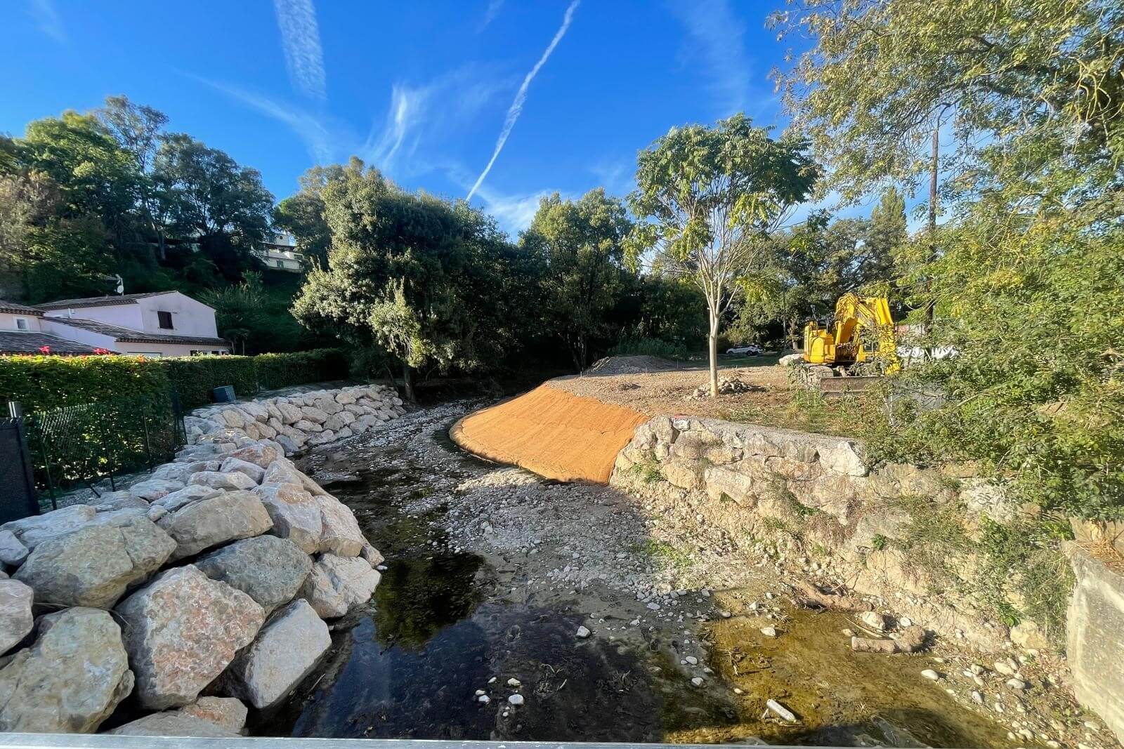 En parallèle, une opération de gestion des espèces invasives a été menée, incluant notamment l’arrachage des cannes de Provence. Les talus ont été reprofilés en pente douce, recouverts d’un géotextile biodégradable et ensemencés avec des espèces herbacées locales.